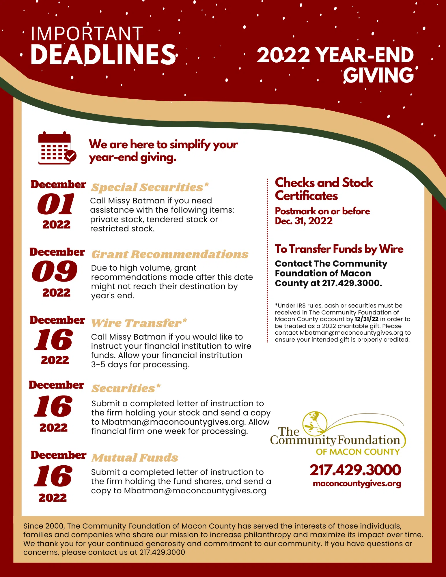 So they may provide the best possible service and ensure that your year-end gifts qualify for a charitable income tax deduction for 2022, please review the below list of important deadlines. Please call their office at 217.429.3000. with any questions.