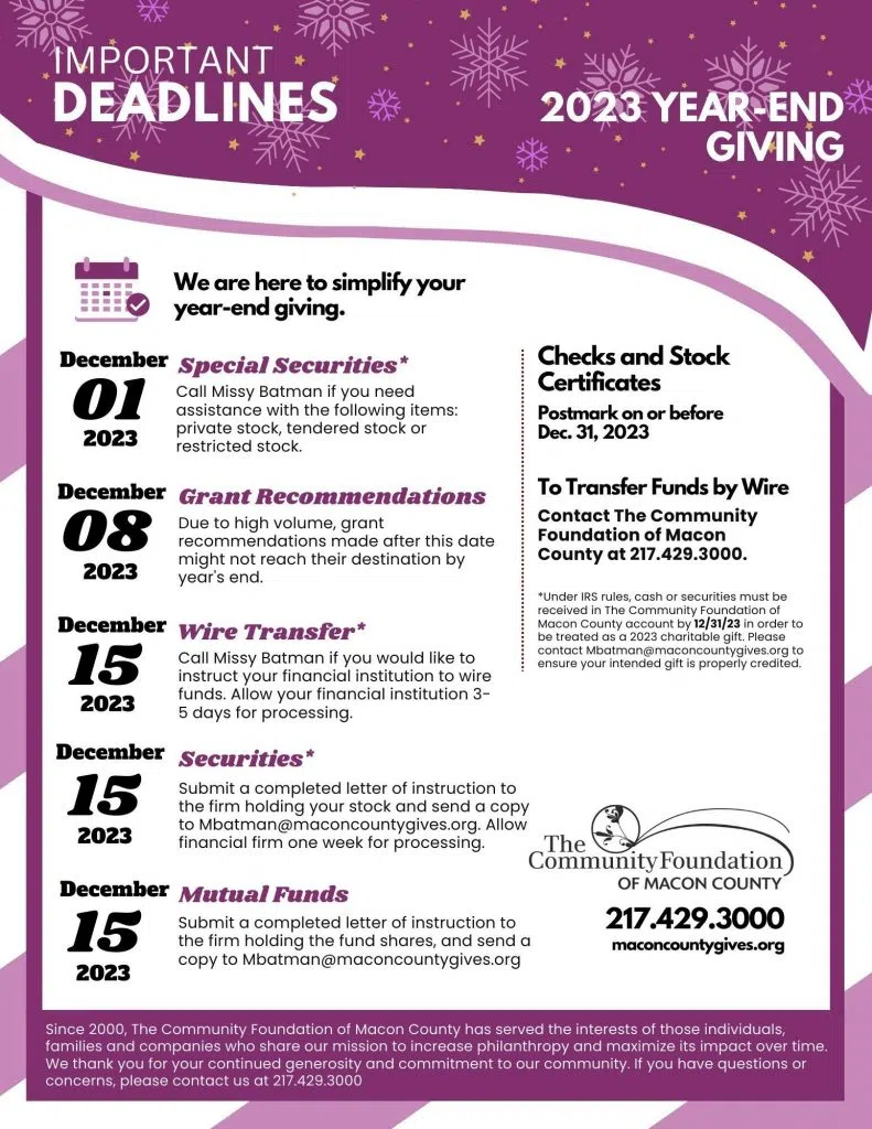 November 15, 2023 -The Community Foundation of Macon County is providing year-end giving deadlines to ensure gifts qualify for a charitable income tax deduction for 2023.